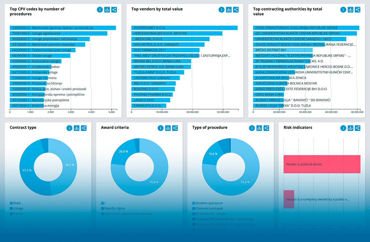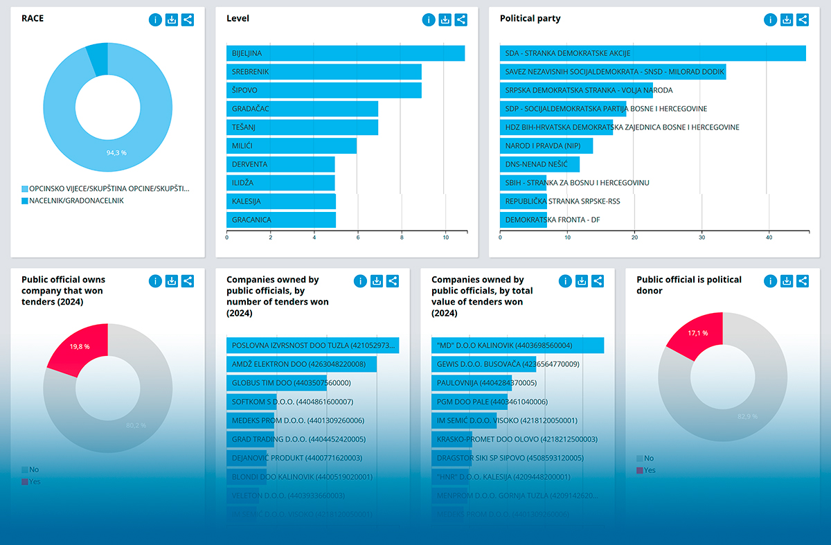 The Integrity Watch Platform for Bosnia and Herzegovina is an open-data platform that allows citizens to explore how money and power intersect in public decision-making processes. Developed by the Transparency International in BiH (TI BiH) the platform brings together datasets on political financing, public procurement, and asset declarations of elected officials, which represent the three areas most vulnerable to corruption and abuse of public office.