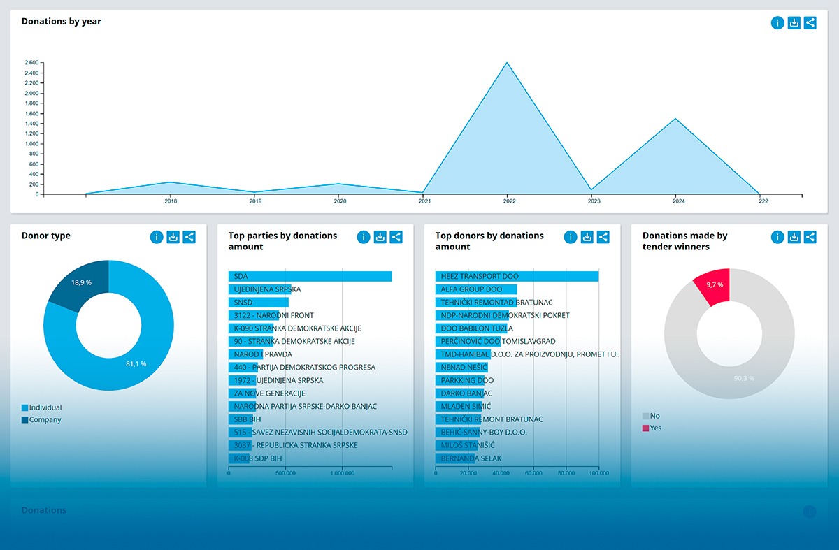 The Integrity Watch Platform for Bosnia and Herzegovina is an open-data platform that allows citizens to explore how money and power intersect in public decision-making processes. Developed by the Transparency International in BiH (TI BiH) the platform brings together datasets on political financing, public procurement, and asset declarations of elected officials, which represent the three areas most vulnerable to corruption and abuse of public office.